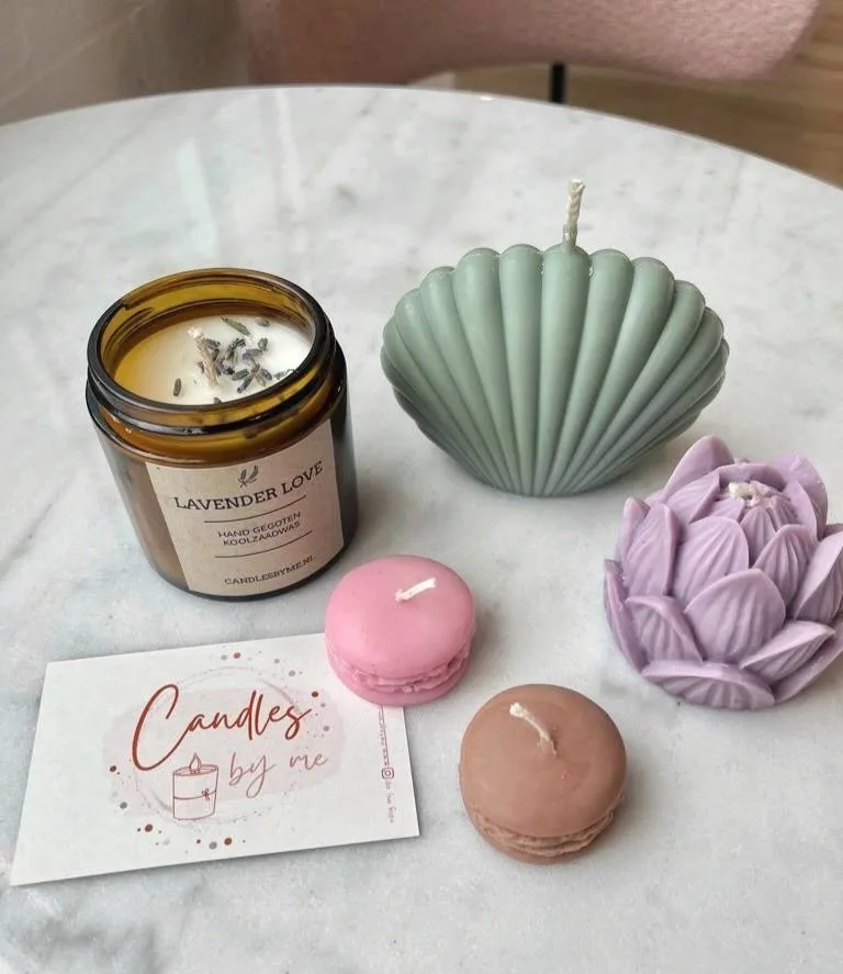 Ik gebruik duurzame materialen die vriendelijk zijn voor het milieu, zoals koolzaadwas, droogbloemen en Jesmonite. Ook maak ik graag gebruik van vintage theekopjes als basis voor mijn geurkaarsen.